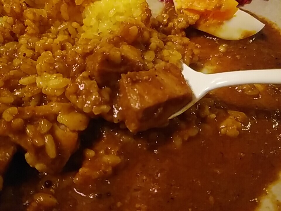カレーは甘めで適度なスパイシーさとトマトの風味、美味い。
