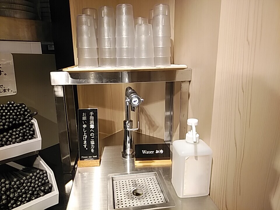 券売機で食券購入後オーダーエリアで渡しましょう。給水機が右にあるので用意。