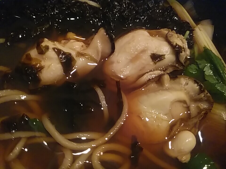 細麺選択。汁に牡蠣のエキスが染み出ており 白濁してて美味いです!!