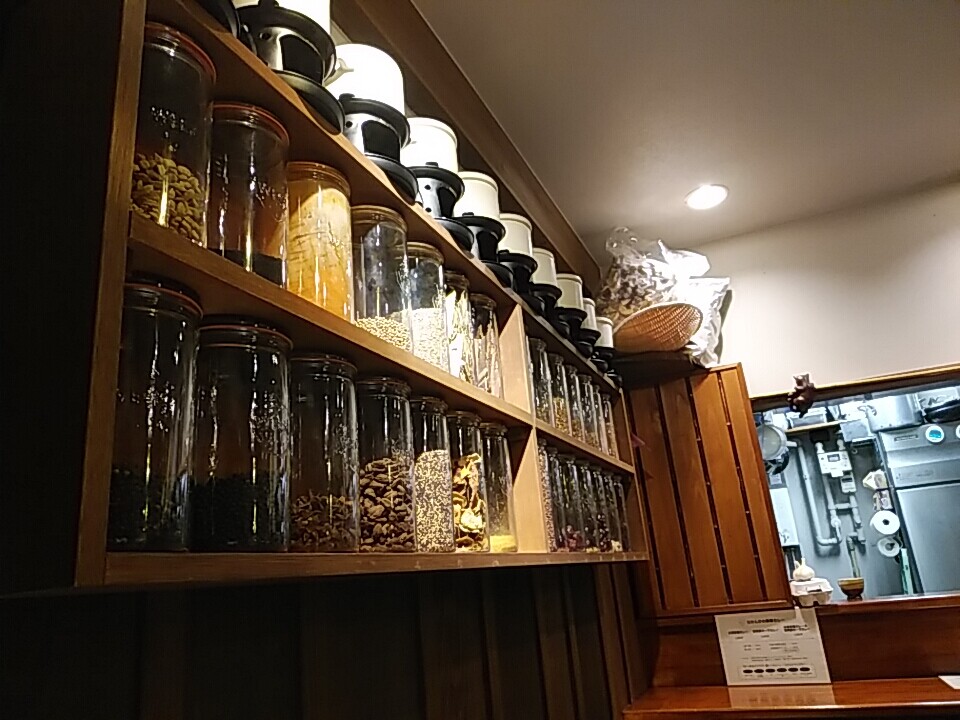 テーブル席3、カウンター5程のしっぽり店内。薬膳・スパイスが大量にストックされている。