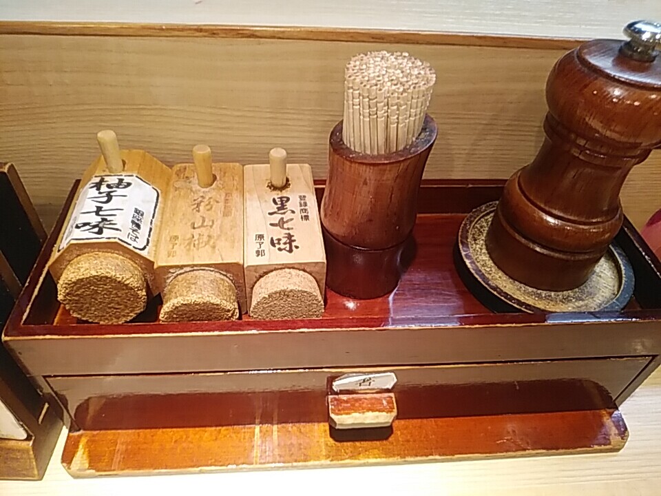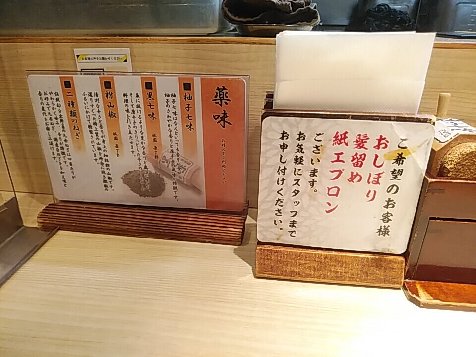卓上に薬味の説明あり。あと、紙エプロン要か聞いてくれます。