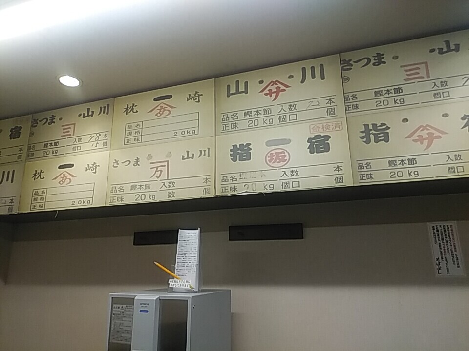 天井に鰹節のストックが大量にある。産地は多々に渡っている。