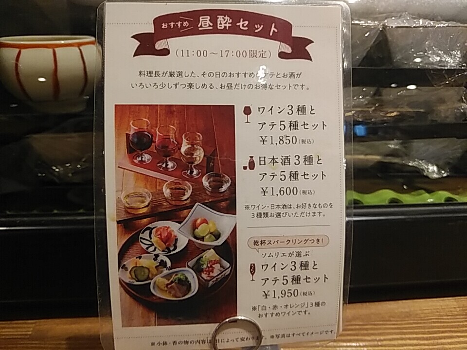 ワインセット(1850)と日本酒セット(1600)がある。税込みです。11〜17時限定。