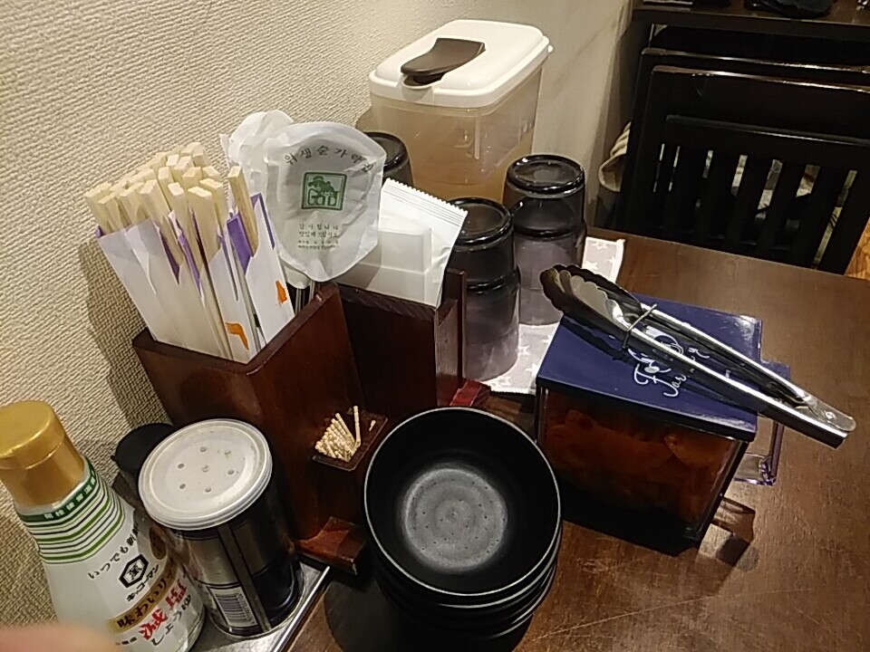 卓上セット、スプーンが包装されてて韓国料理屋ぽくいいね。