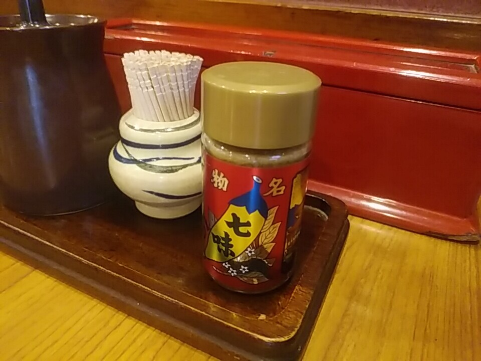 卓上七味、あ、これ長野出張行ったときお土産屋にあったものだ!(八幡屋礒五郎) 施し堪能〜