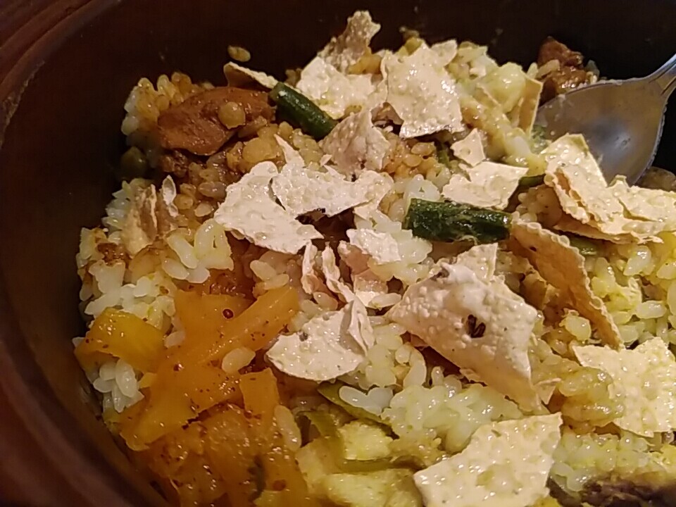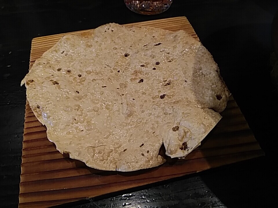 せんべいみたいの(パパドゥってものらしい)で、パリパリしてて香ばしく 投入したら更に旨くなった。