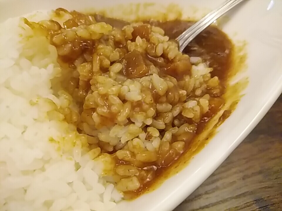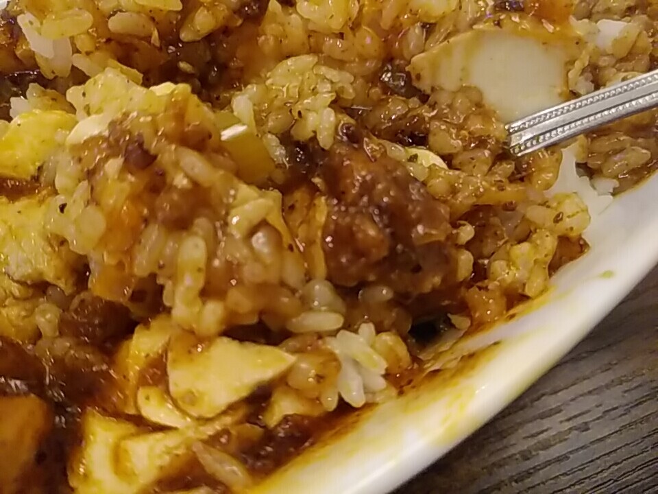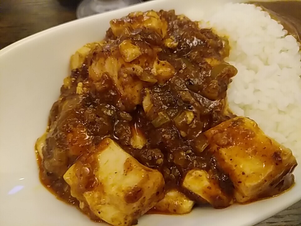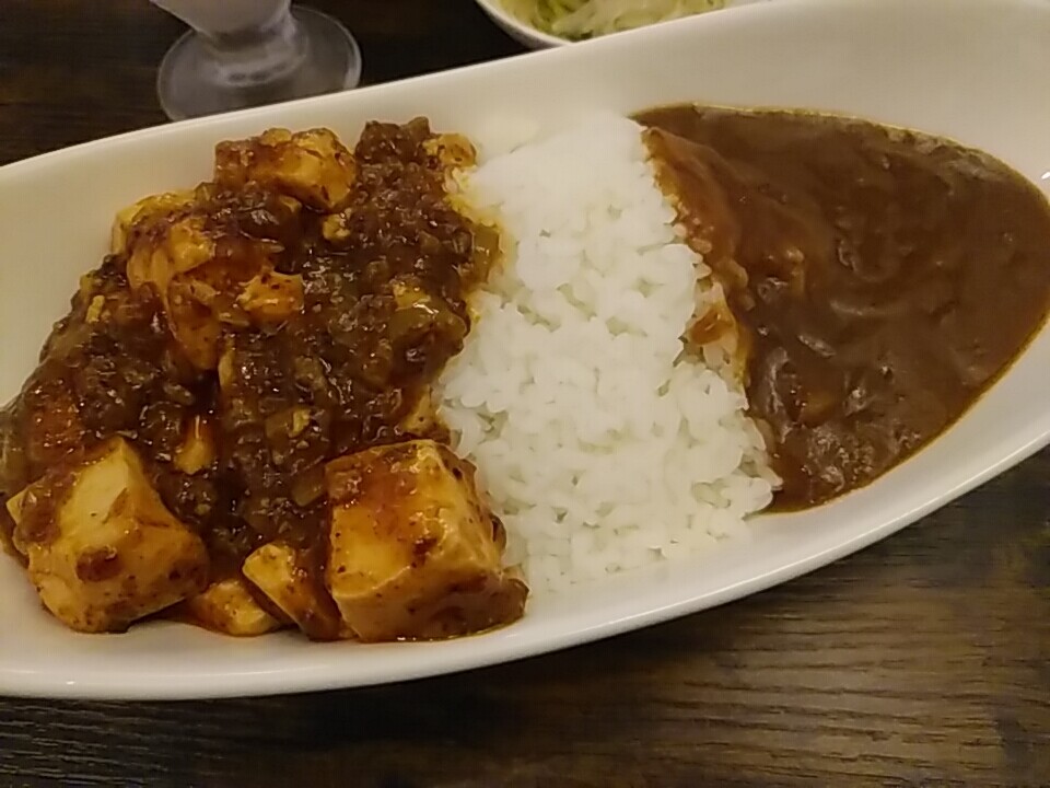 カレーと麻婆豆腐の相掛けです。ご飯大盛り可でボリューミーになる。