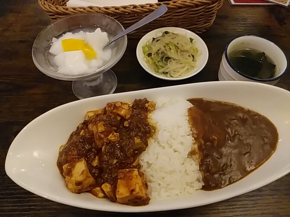 注文の品:麻婆カレー(麻婆とカレーの相掛け、ご飯大盛可、小鉢、スープ、杏仁豆腐)
