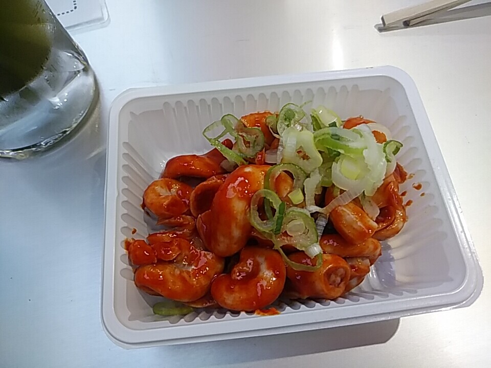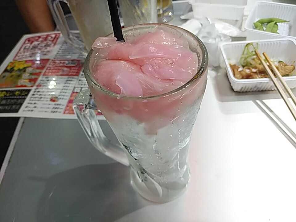 晩酌セットで緑茶ハイ。ホルモンボイルはコブクロ。鮮度良く臭味はない。