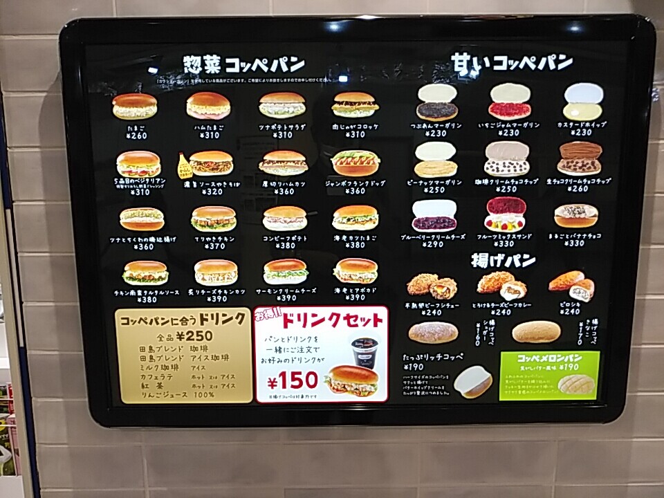 注文の品:イートインお得セット / テイクアウト(総菜コッペパン、甘いコッペパンなどなど)