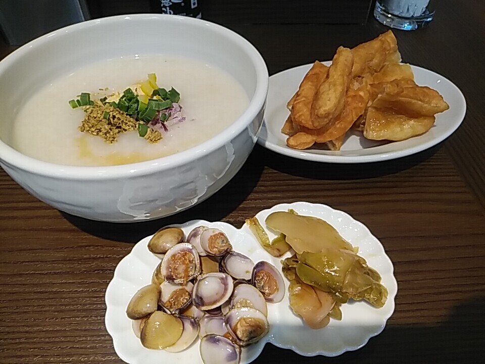 注文の品:貝出汁粥 鬼貝セットM(シジミ醤油漬け、漬物、揚げパン)
