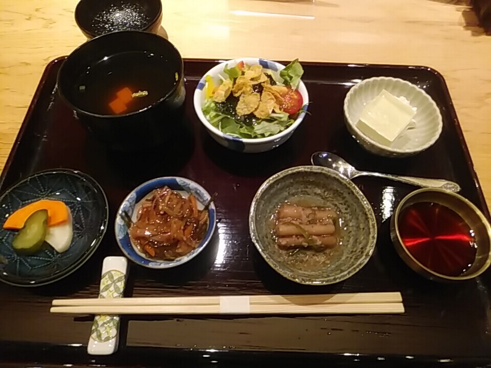 小鉢はサラダ、松前漬けとゴボウの煮物。
