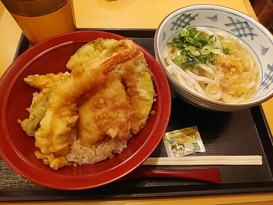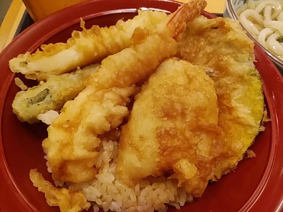 天丼には、海老、イカ、キス、かぼちゃ、おくらが乗る。