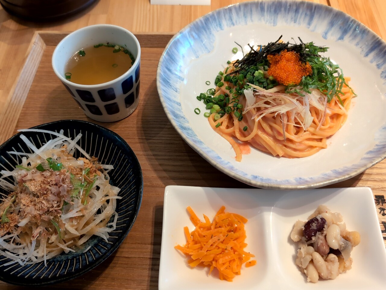 注文の品:ランチAセット(罪なたらすぱ、大根サラダ、本日のミニ総菜、スープ)