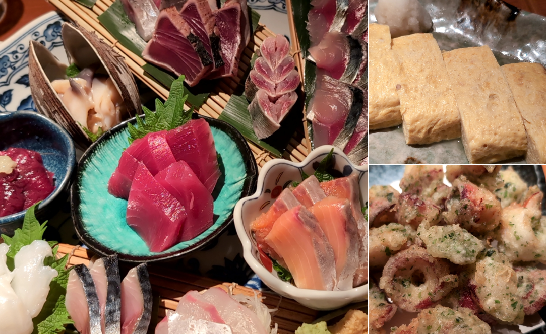 左上から、ブリ、アジ、カツオタタキ、イワシ、活き〆生さば、クジラ、生ホッキ貝、マグロ、サーモン、生タコ、しめ鯖、タイ