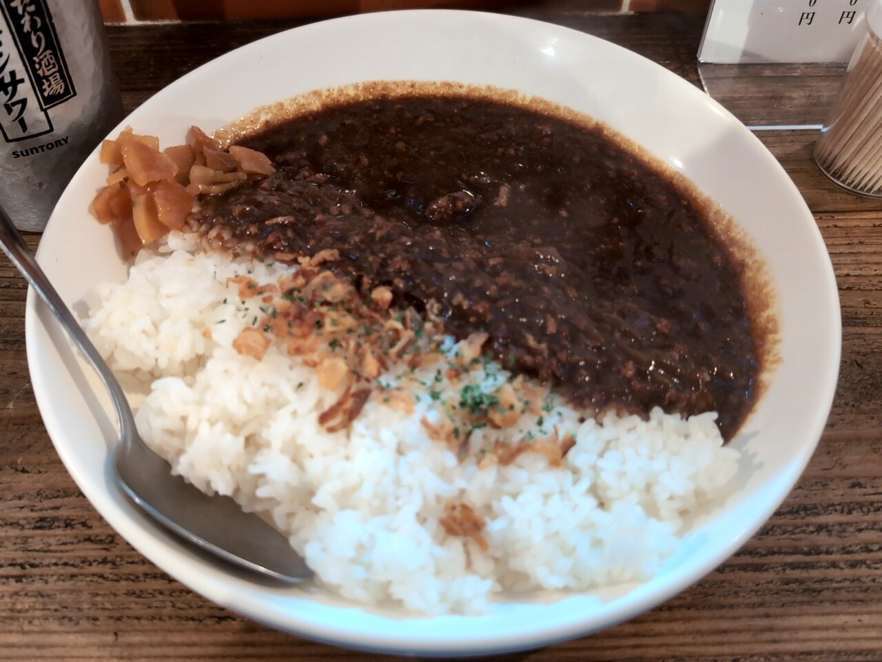 キーマカレー的で挽肉ベース。フライドオニオンが乗っている。