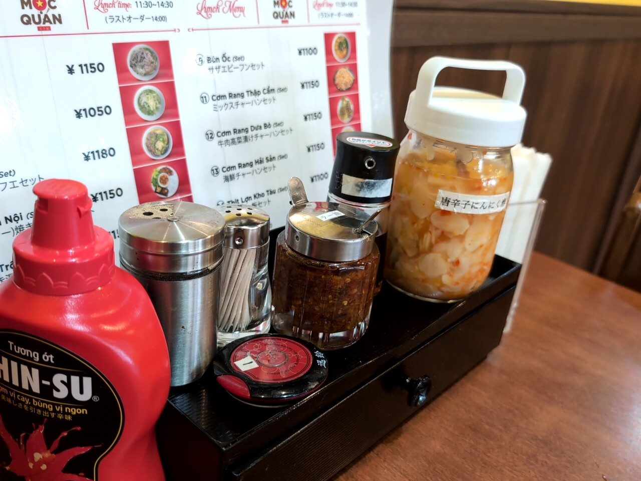ニンニク酢、ナンプラー、ラー油、CHIN-SU(チンスー)チリソースなどあり