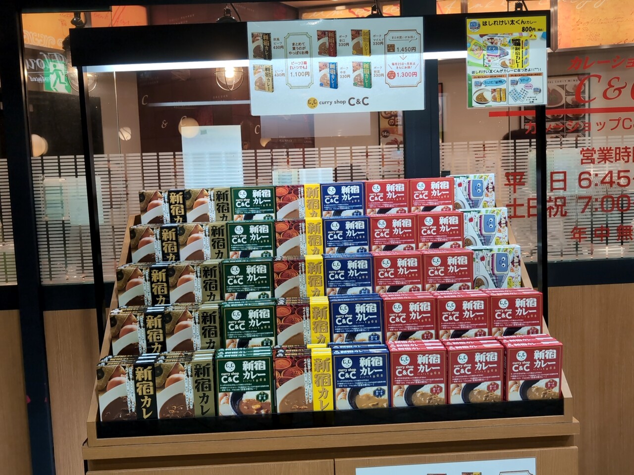 店頭に大量にテークアウト用レトルトカレーが陳列されている。