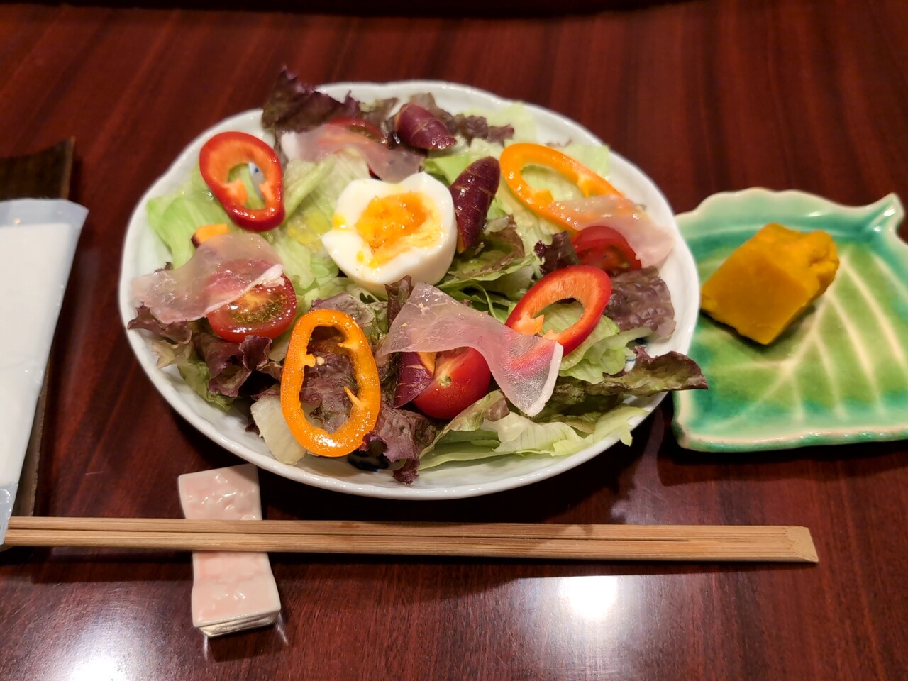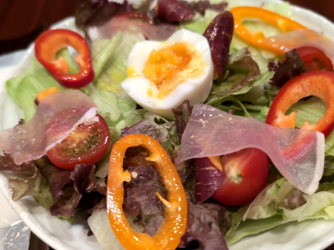レタスをベースにパプリカ、トマト、半熟玉子、生ハムが乗る。