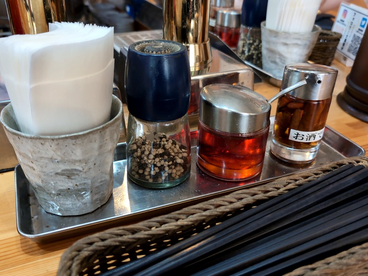 卓上に粒胡椒、ラーユ、酢があるので味変を堪能できるのも良い。