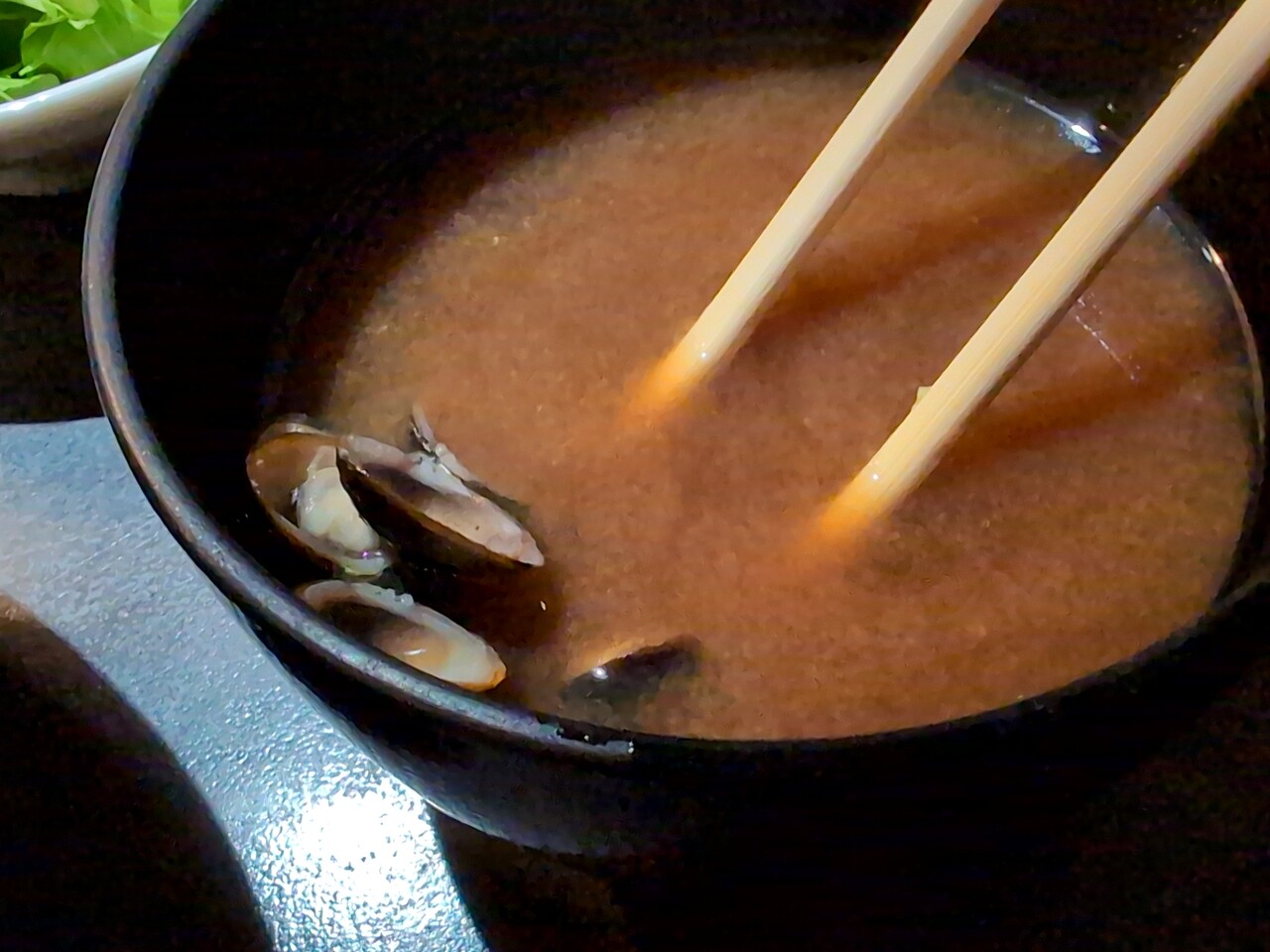 味噌汁も赤だしでシジミ入り。