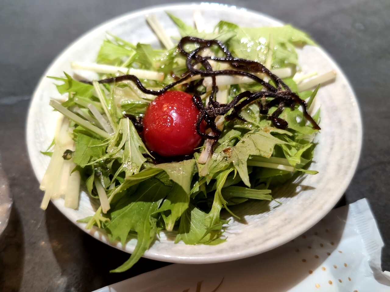 水菜で塩昆布が施されており、シンプルなフレンチドレッシングで美味しいです。