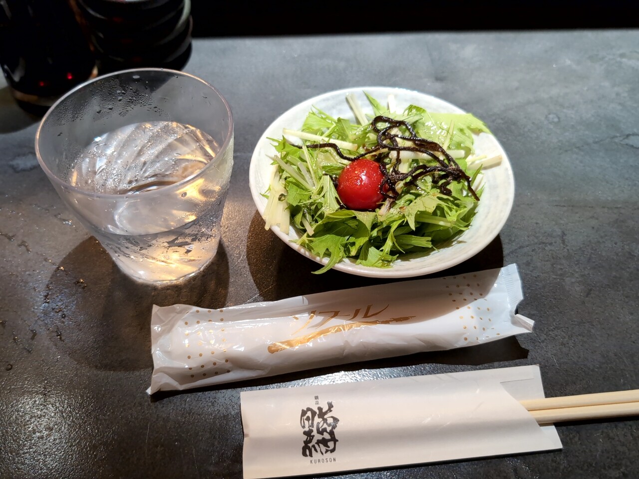 先にサラダ、水、おしぼり、箸がセットされる