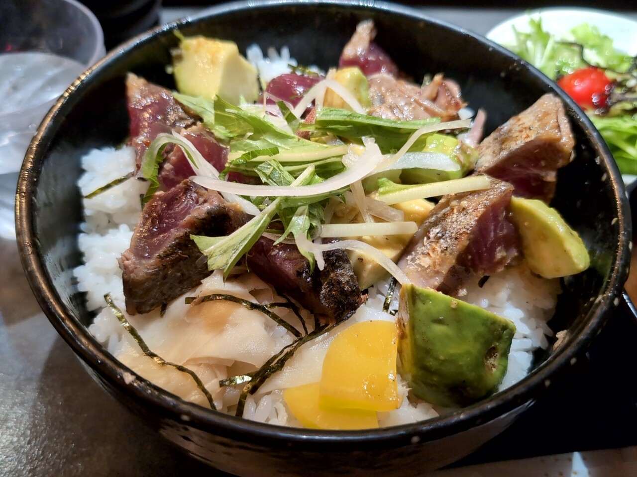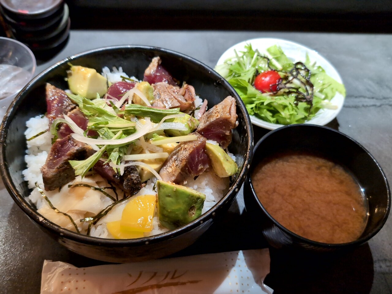 注文の品:数量限定 アボカドカツヲ丼(サラダ、赤だし、ご飯大盛可)