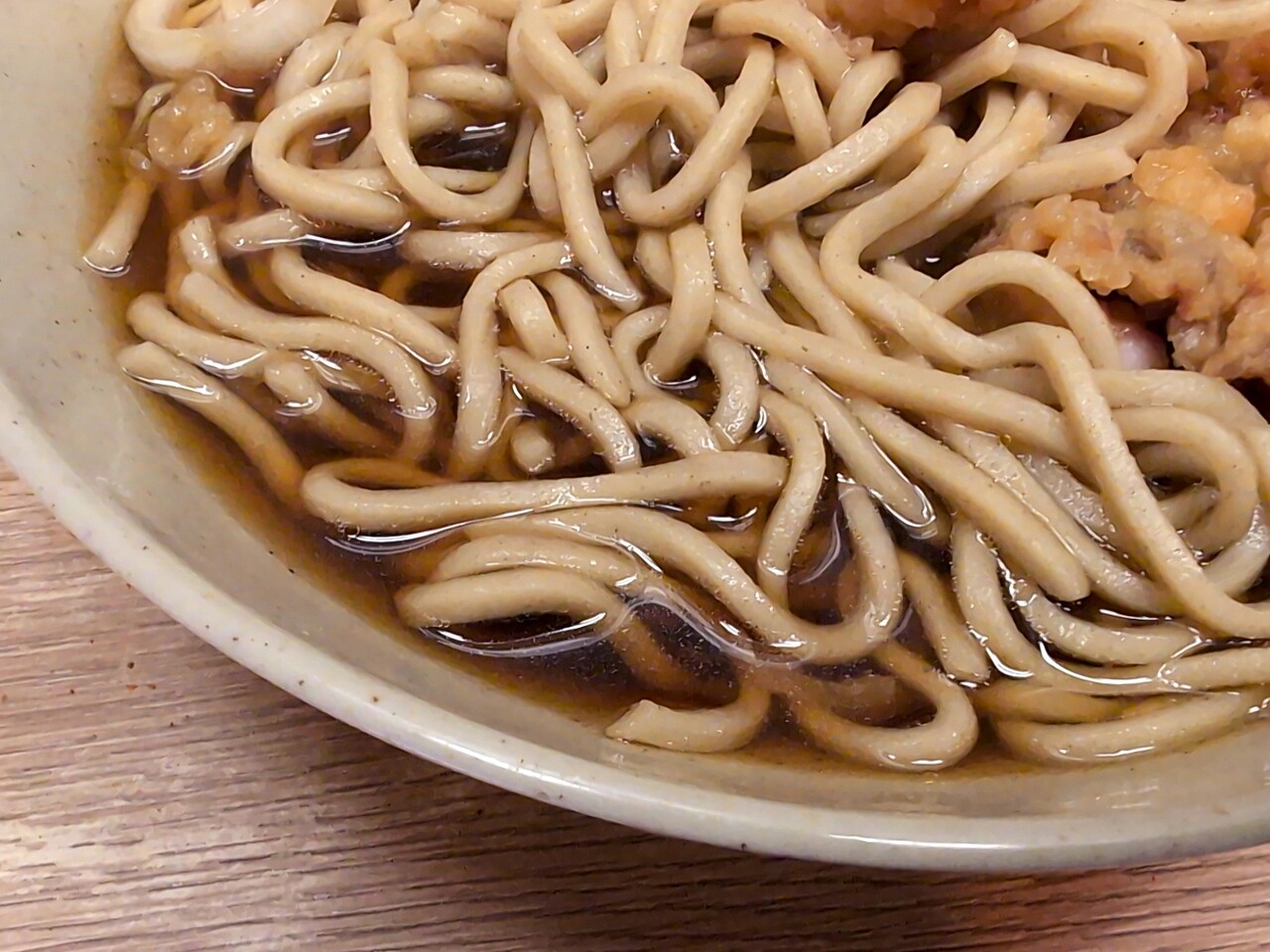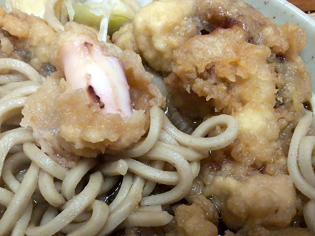 げそ天は表面クリスピーで汁に浸すといい感じになる。