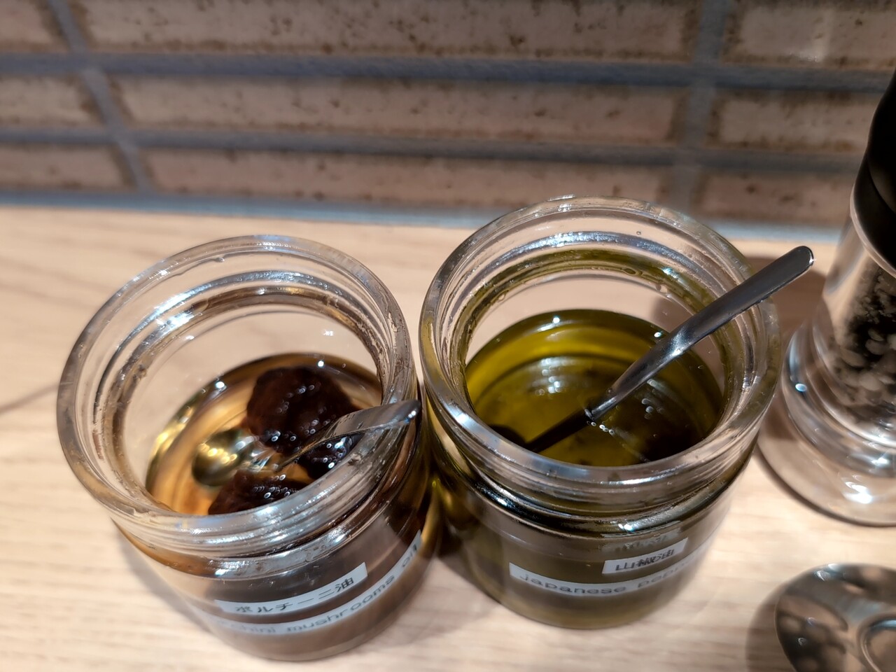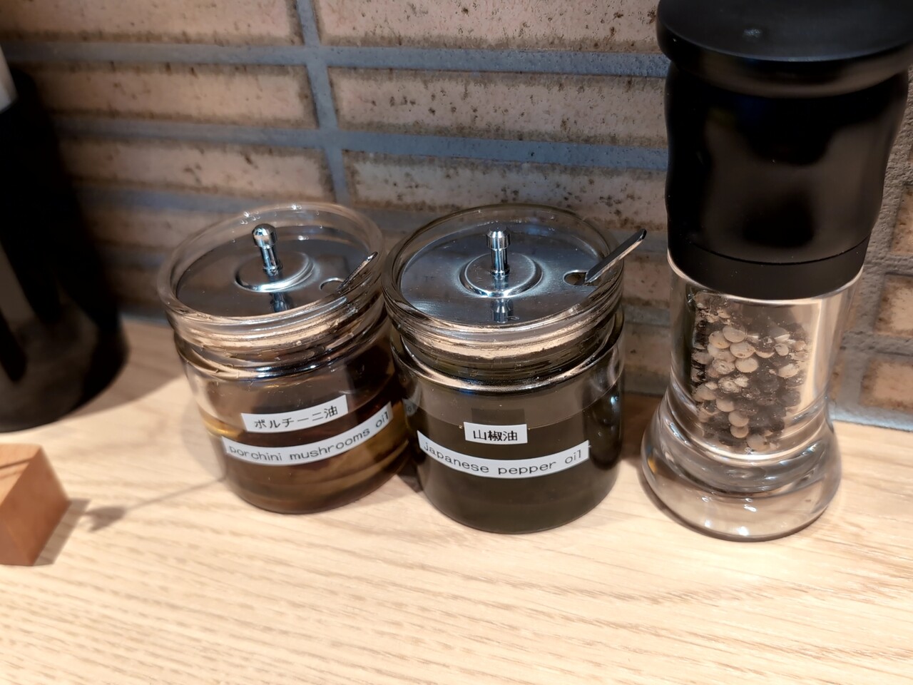 卓上にポルチーニ油と山椒油あり、味変に良いです!