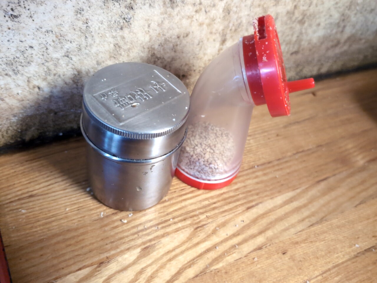 卓上にはゴマぐりぐりマシンと唐辛子あり。