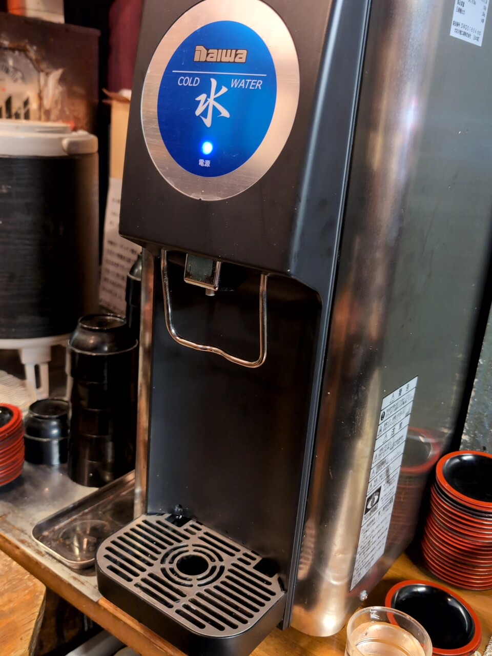 注文後に右側にある給水機で水を補給し、ワサビとネギを事前に用意。