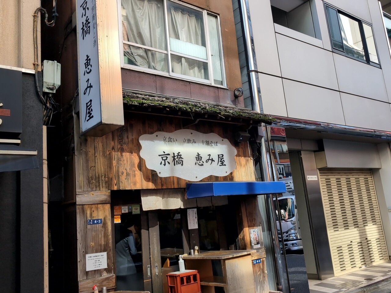 京橋 立ち食いそばの名店 恵み屋(めぐみや)でございます。