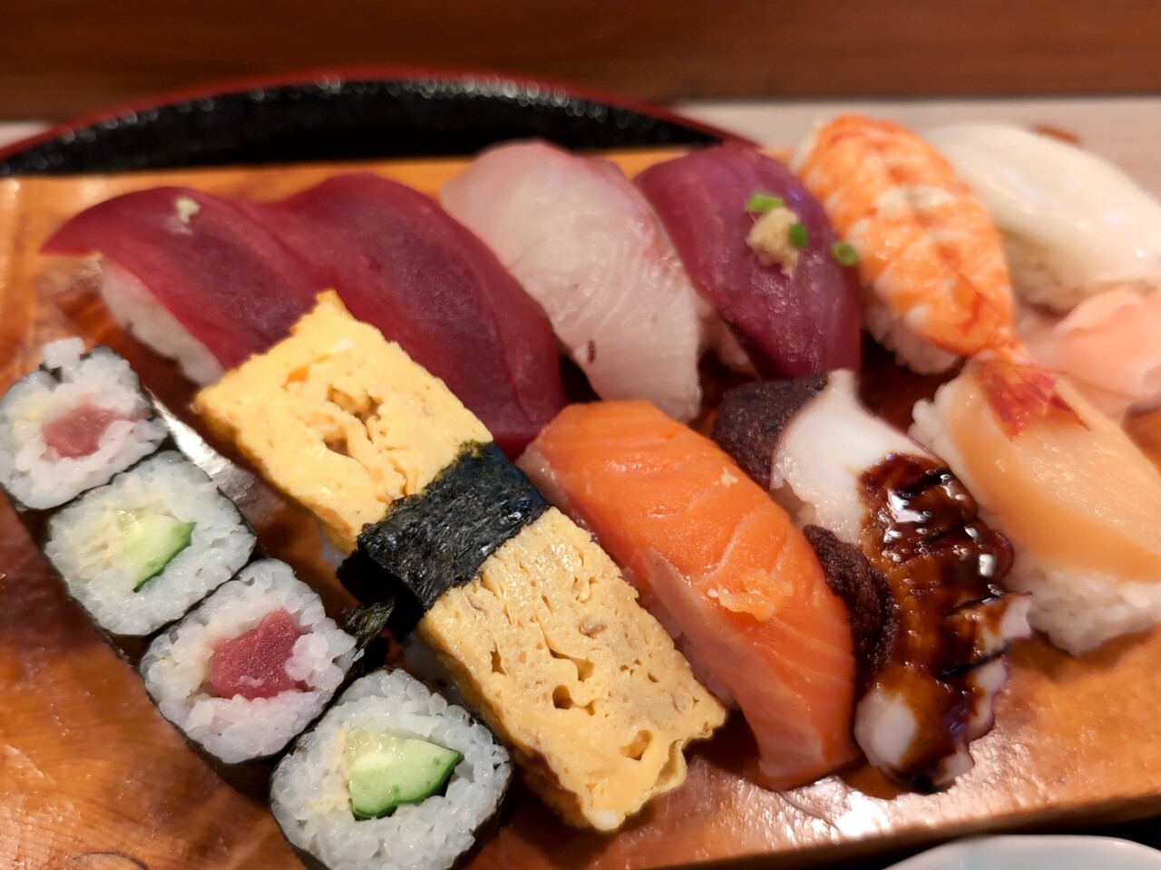 マグロ赤身、カンパチ、初カツオ、エビ、イカ、玉子焼、サーモン、タコ煮、ホタテ に巻物。