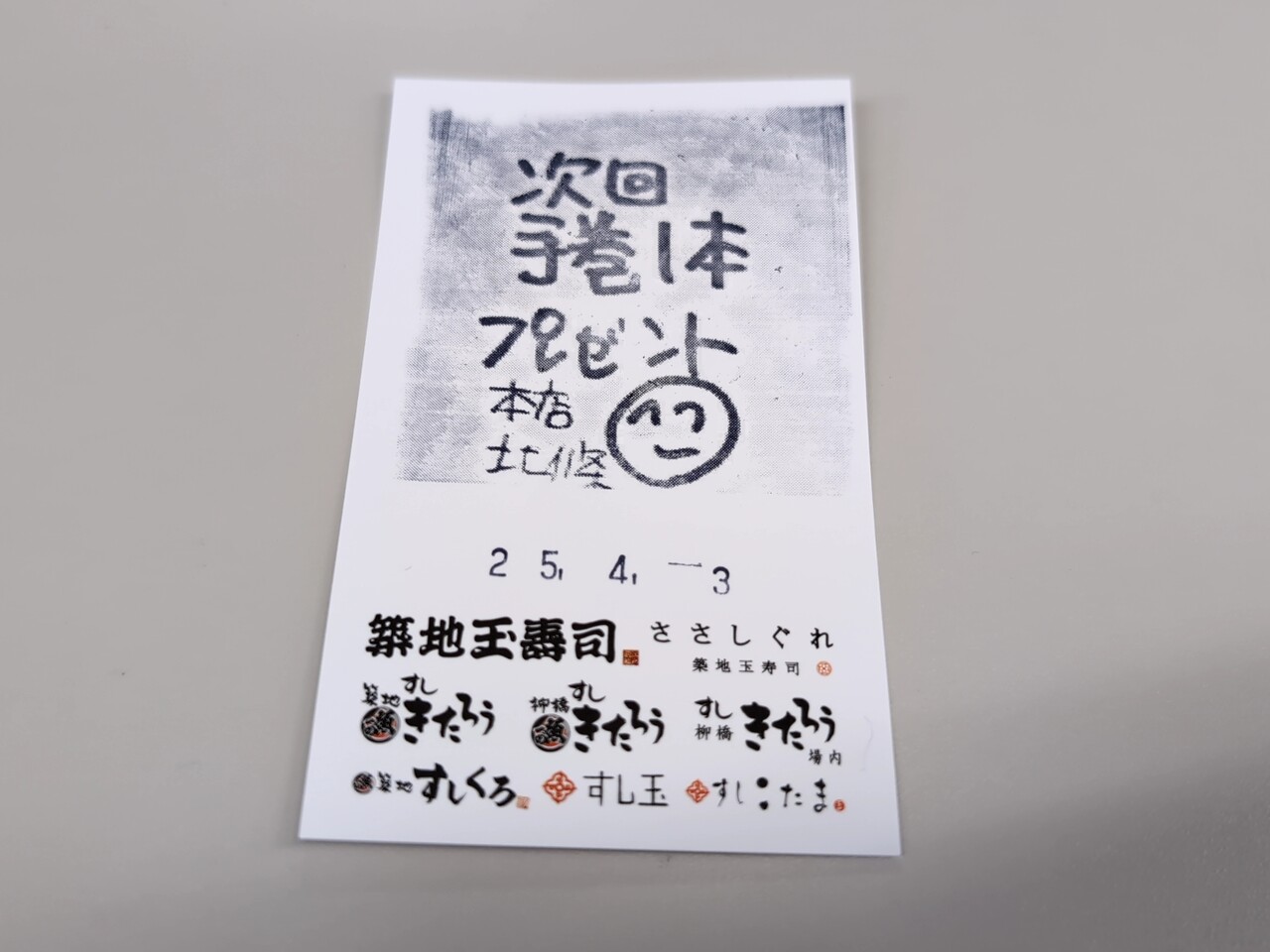「次回手巻き寿司プレゼント券」が会計時に渡さるんです!