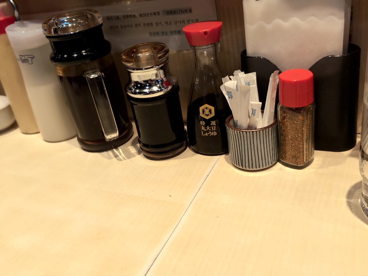 卓上アイテムには、マヨネーズ、キャベツ用ドレッシング、ソース、醤油、七味など用意されている。