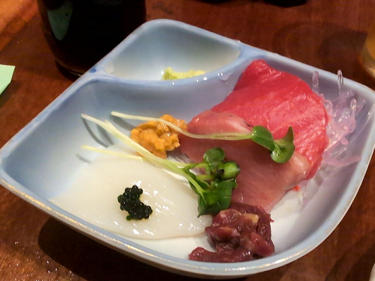 良質なマグロ2にウニとイカ、それに馬刺し。