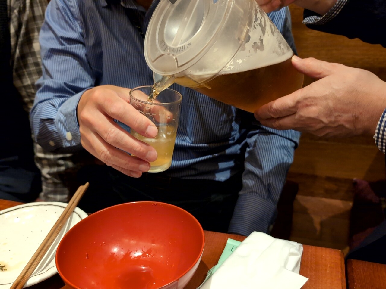 飲み放題のビールは秋田産ホップ使用のキリンラガーでピッチャーで提供される。