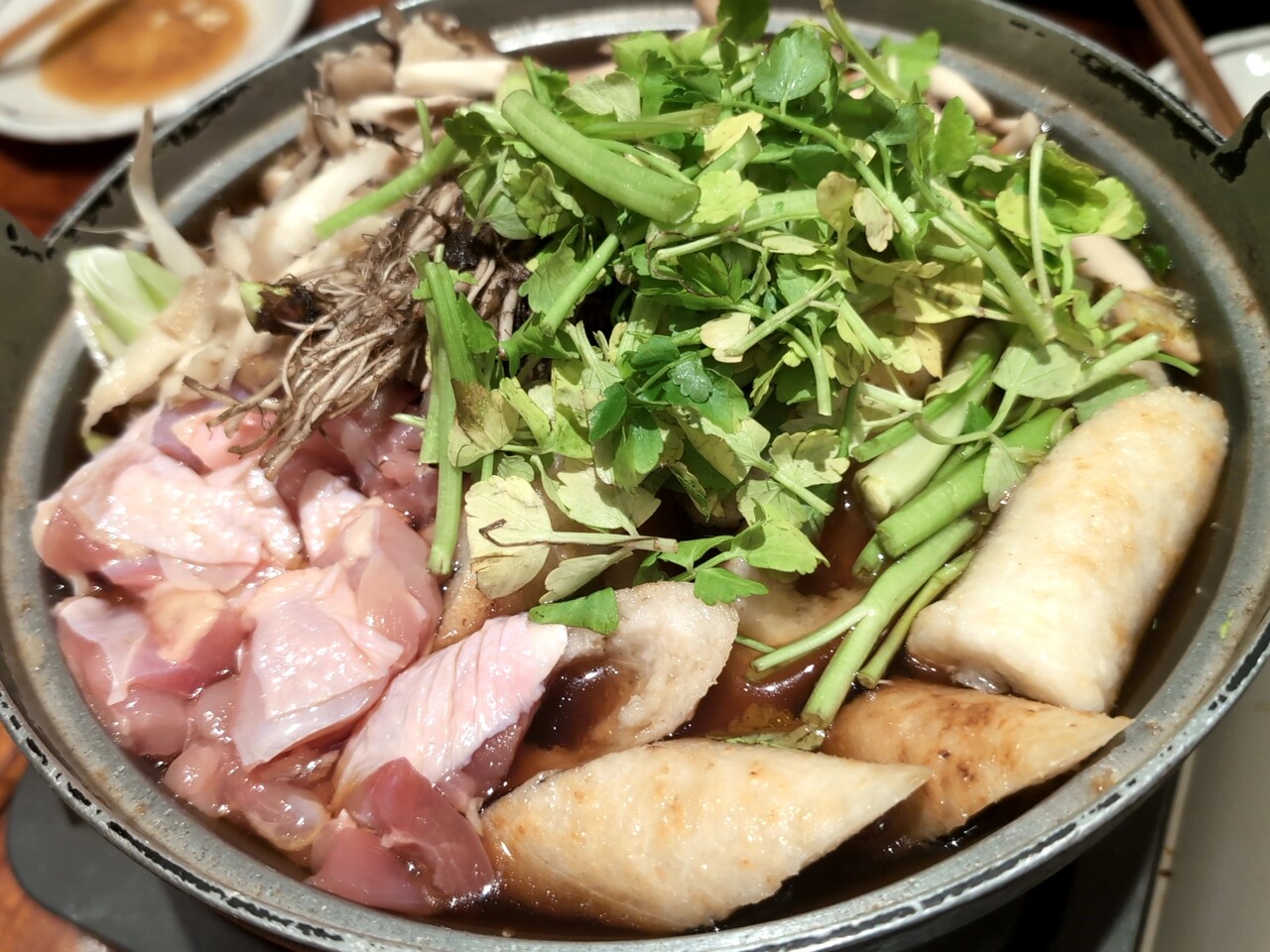 セリの風味に比内地鶏の出汁、きりたんぽのふごふご感にたっぷりの野菜。