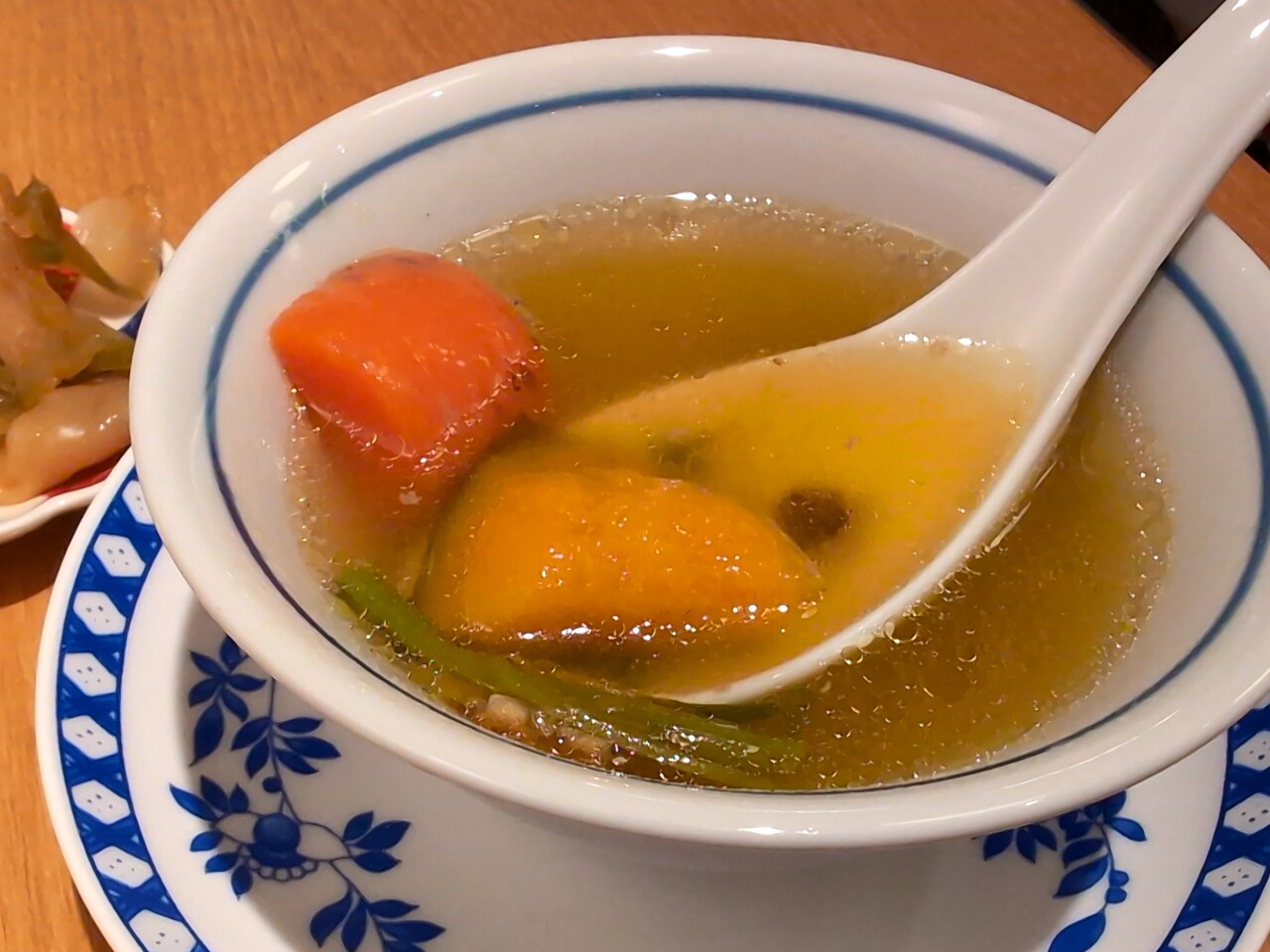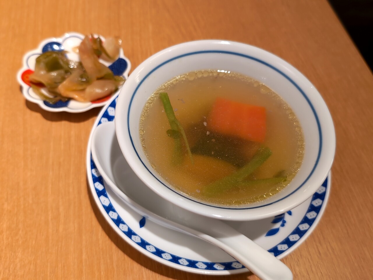 ・先に日替わりスープとザーサイが提供される(どっちも美味しい)