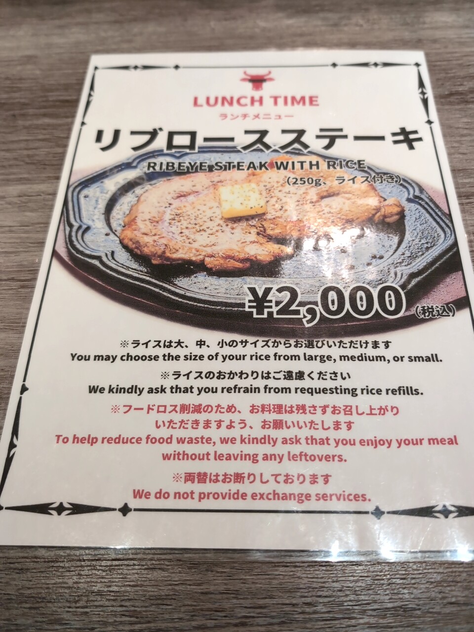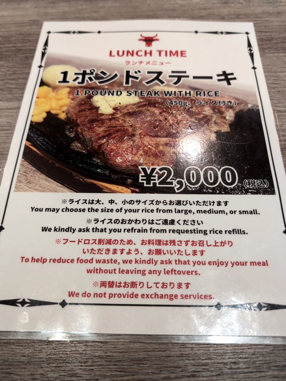 注文の品:ランチ1ポンドステーキ(ご飯 大中小可)