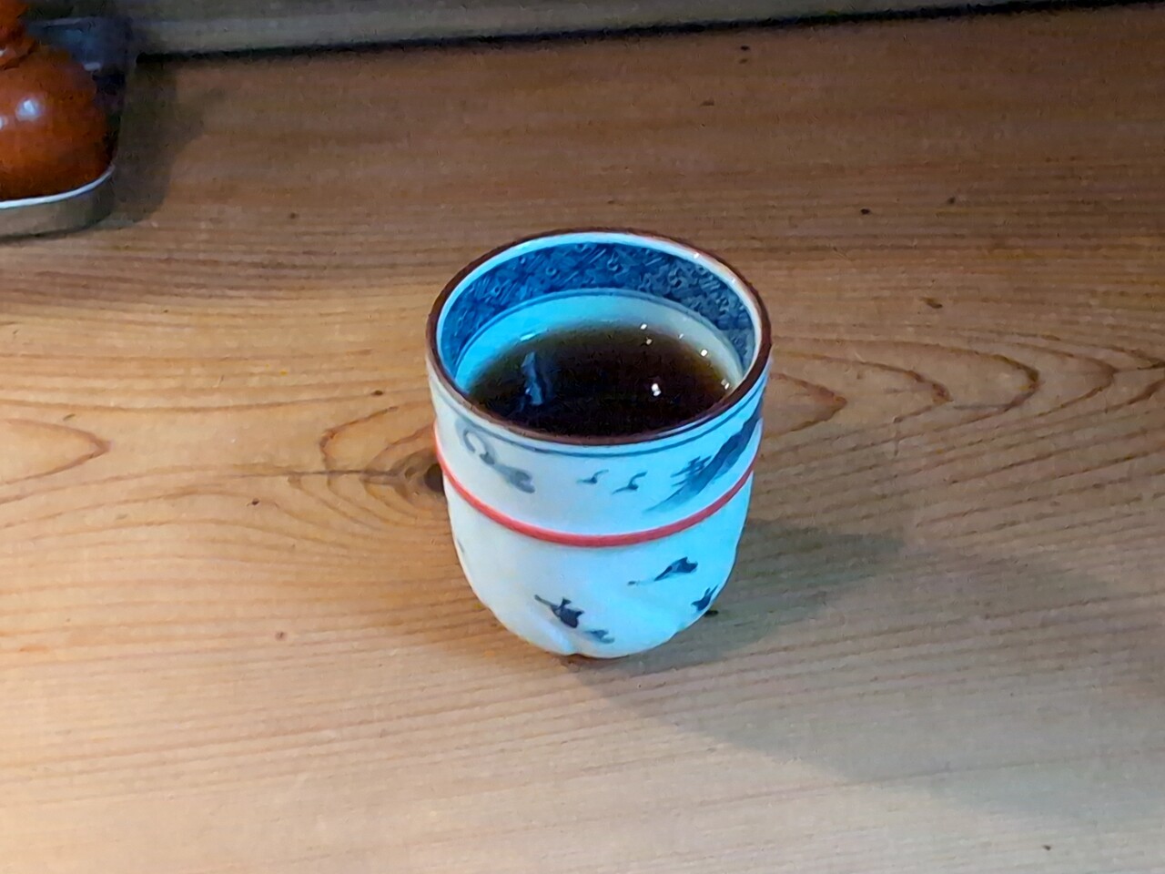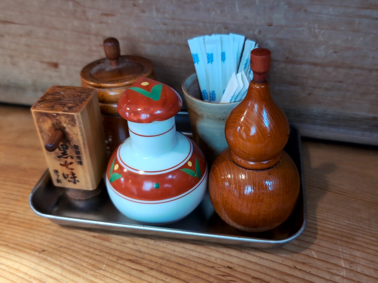 卓上に、黒七味、一味、山椒 等あり。