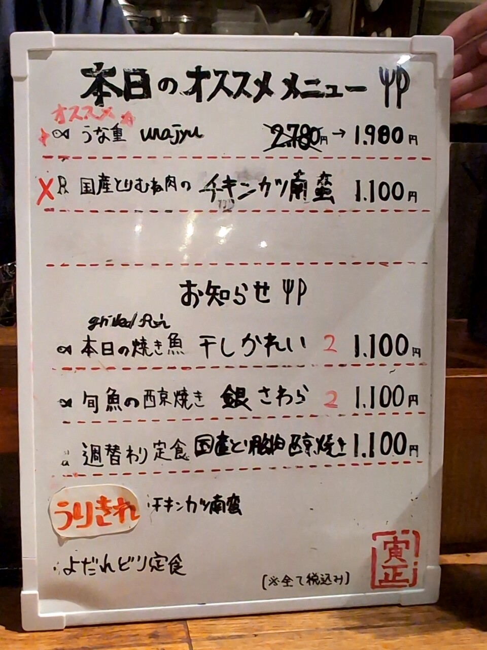本日のオススメで店内掲示されたのは全部1100円以上
