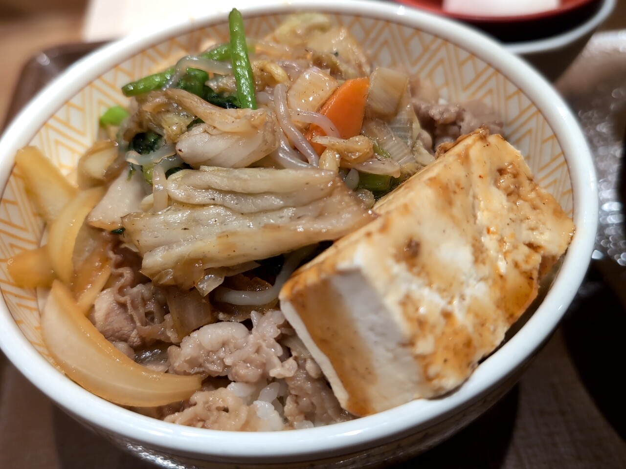 「月見すきやき牛丼」には豆腐、白菜、玉ねぎ、人参、そして春菊だ。