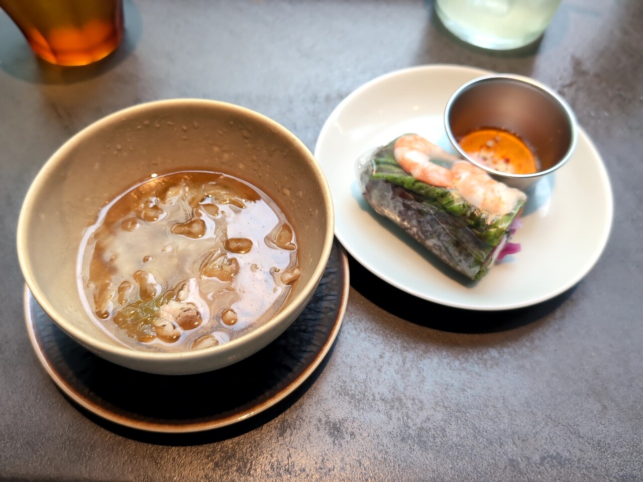 生春巻き、スープ、前菜の盛り合わせ、メインディッシュ選択、ドリンクとデザートまで付いた平日限定のお得なランチコース