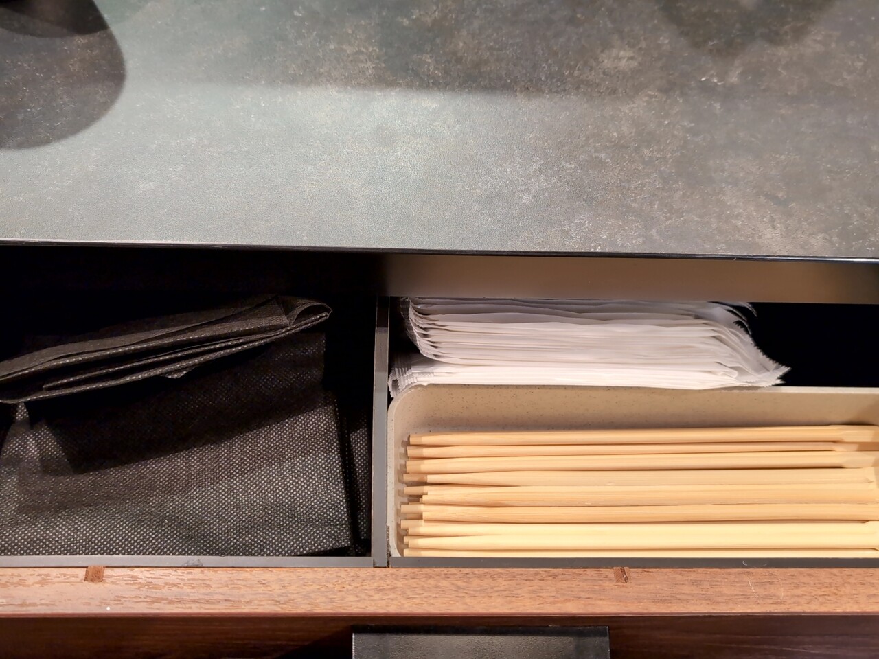 箸、エプロンは席下の引き出しにあります。