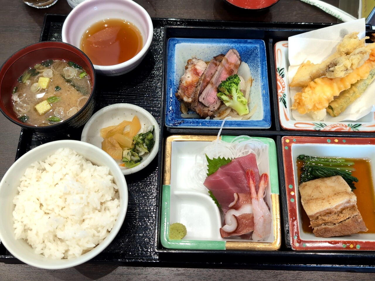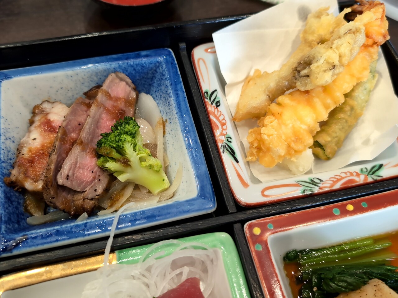 牛ステーキ、天ぷら、刺身、豚角煮などなど