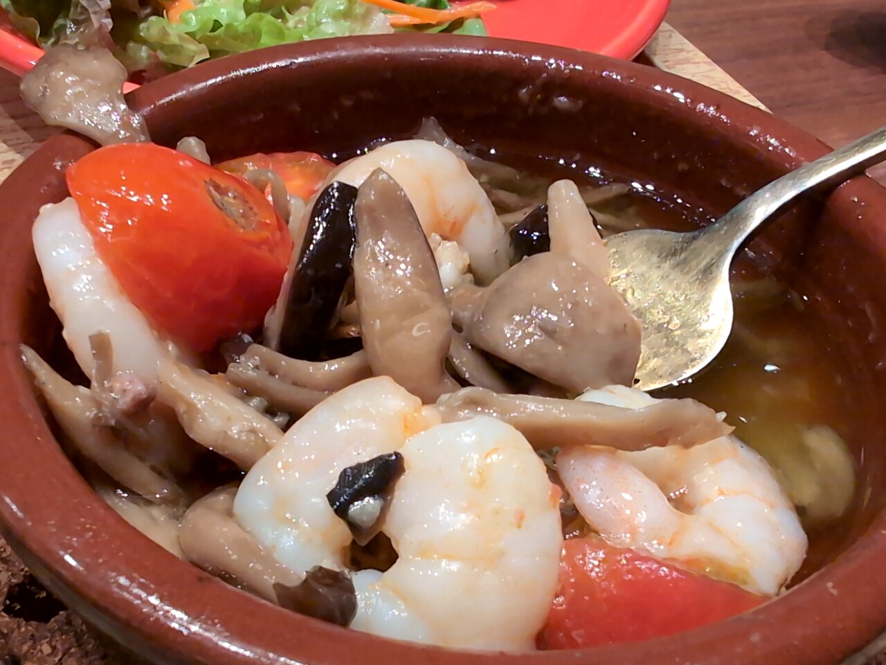 注文の品:海鮮のパエリャ & 海老とキノコのアヒージョ(サラダ、バッケット、コーヒー付き)