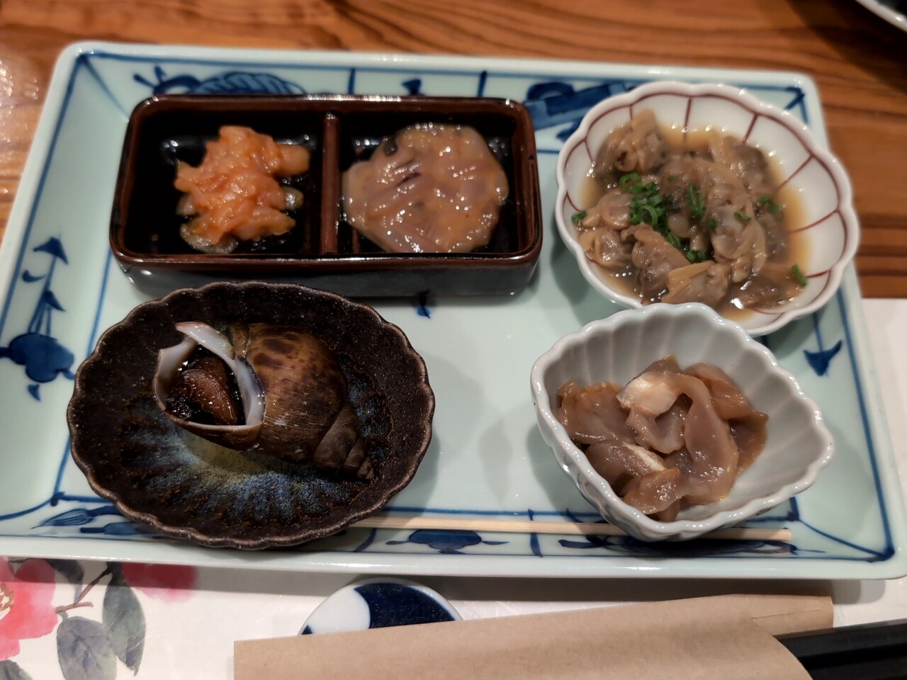 チャンジャ、塩辛、赤貝ヒモ煮、アサリ佃煮、黒バイガイ。